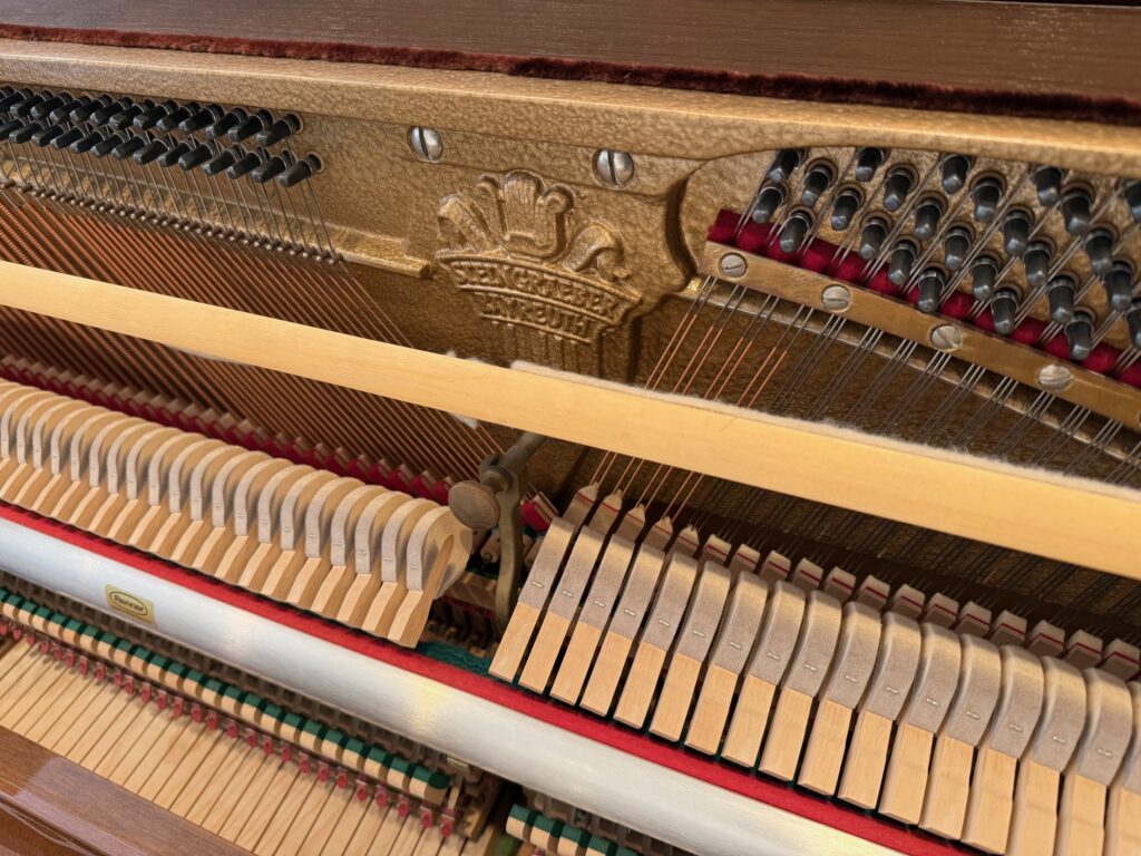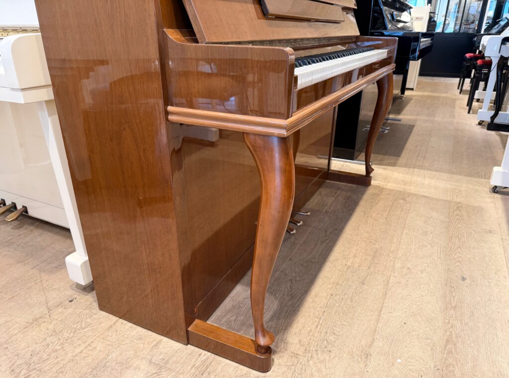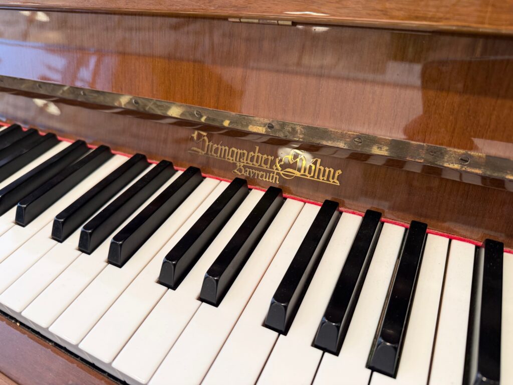 Rare piano STEINGRAEBER d’occasion ; Il n’est pas commun de rencontrer ce modèle 116 dans une belle finition Noyer, fabriqué par la Manufacture de Bayreuth en Allemagne, celle-ci n’ayant plus au catalogue que de hauts pianos droits (122, 130 et 138 cm). L’instrument est un joyau sous les doigts, la sonorité ronde et noble nous émeut et le raffinement du timbre est un bonheur.